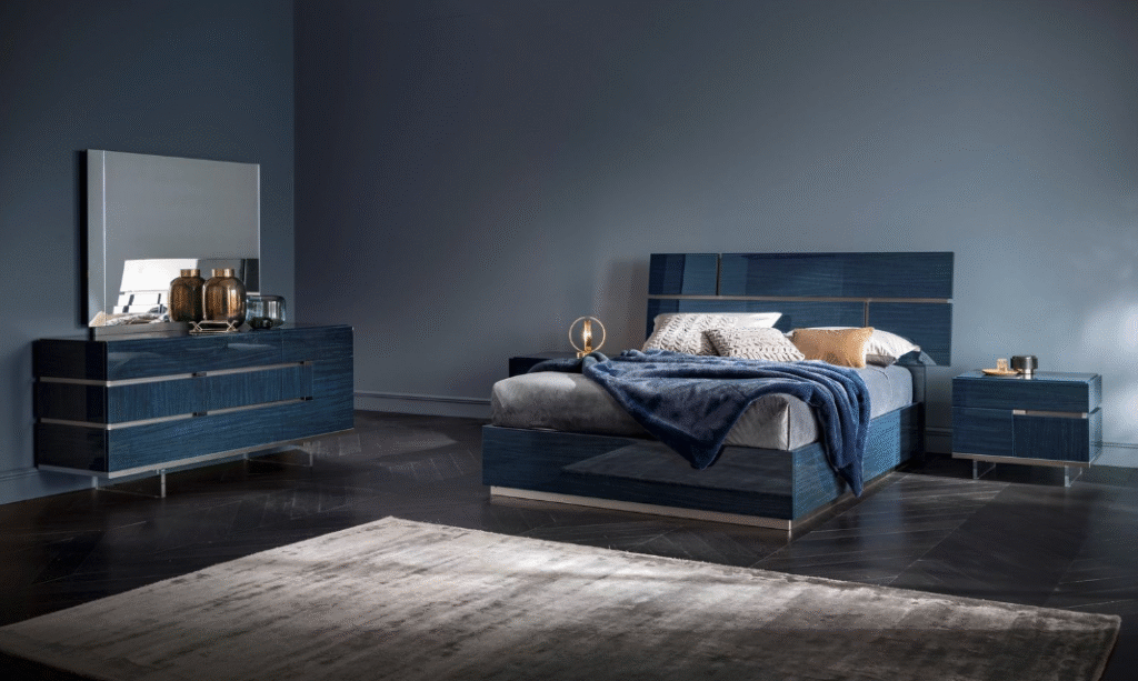Bova Dallas introducing for the first time The BLUE SAPPHIRE bedroom collection. Whether you’re looking to refresh your space or completely transform your bedroom, the new collection invites you to experience the calming, captivating power of sapphire. All crafted from premium manufactured wood for a flawlessly smooth surface. The sleek blue laminate finish enhances its contemporary appeal. Perfect for a modern upgrade, this set combines with elegance with functionality to transform your space. We’ve created pieces that promise both beauty and longevity. This rich, lustrous tone brings an immediate sense of luxury, allowing you to create a mood that’s both regal and restful.