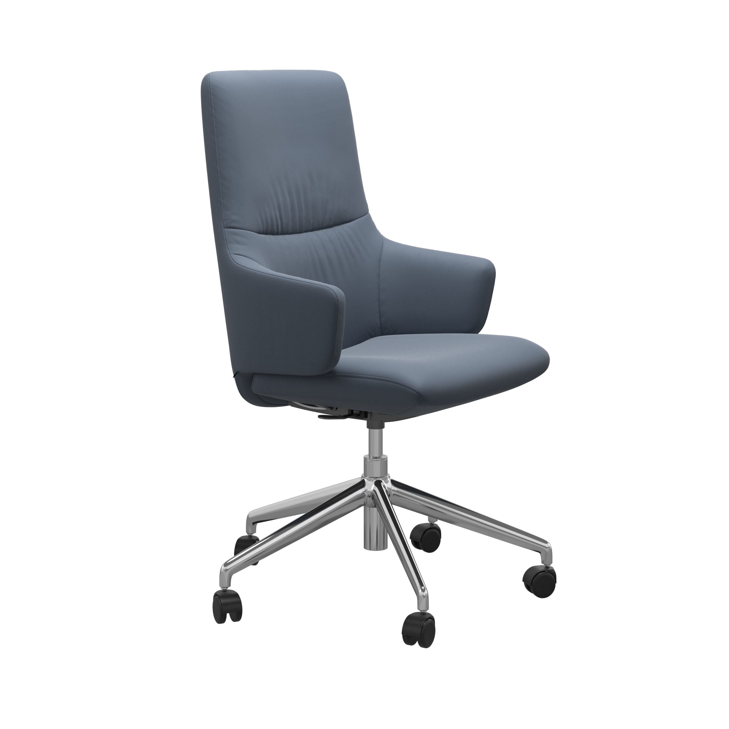 Stressless® Home Office chairs are designed to blend in with any style. The chairs let you effortlessly shift positions throughout the day. The seat and back will follow your movements and offer good support. Lean back and the backrest will recline while the seat moves forward in a coordinated movement. A discrete flexibility in the seat offers good support and reduces the pressure on your lower thighs as you lean forward. The wide range of covers makes it easy to match with the rest of the interior (you can even get Dining Chairs with the exact same cushion design and cover choices). The wheels on the base make it easy to move around and there is also a lever under the seat that allows you to adjust the seat height by up to 4 inches.