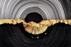 Elevate your space with this captivating 40x60 tempered glass wall art, showcasing a dramatic abstract design that balances movement, texture, and metallic elegance. Layered, flowing lines in gradients of black and gray form a rhythmic backdrop, creating depth and a sense of motion that draws the viewer inward. A bold horizontal sweep of luminous gold cuts across the composition, adding a striking focal point with rich texture and visual warmth.