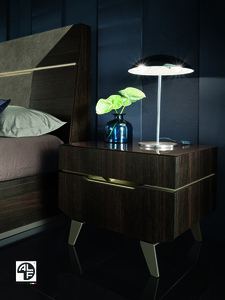 Each nightstand features warm oak tones and elegant gold accents, made in Italy. Sloped drawer fronts and soft-close hardware keep the design clean while making everyday use effortless. Dimensions: W28" × D20" × H22"