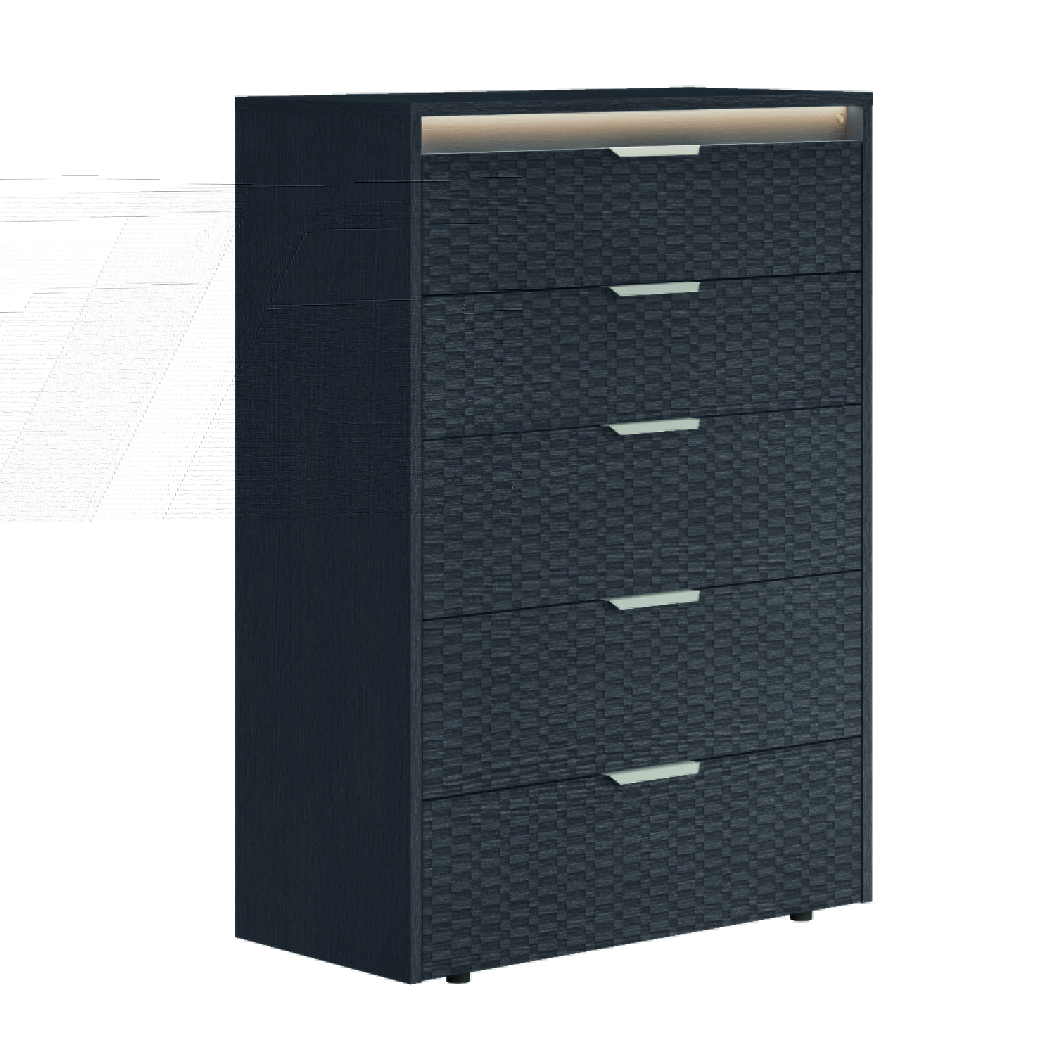 Bring refined storage to your bedroom with the Amy High Chest by ALF Italia. Its tall, space-saving silhouette features Matte Eco Dark Oak with Tetris-textured drawer fronts that add subtle dimension without any gloss—just a warm, modern matte look crafted in Italy. Optional lighting highlights the grain and texture for a soft, elevated glow. An optional lighting kit adds ambient illumination along the front to showcase the texture.