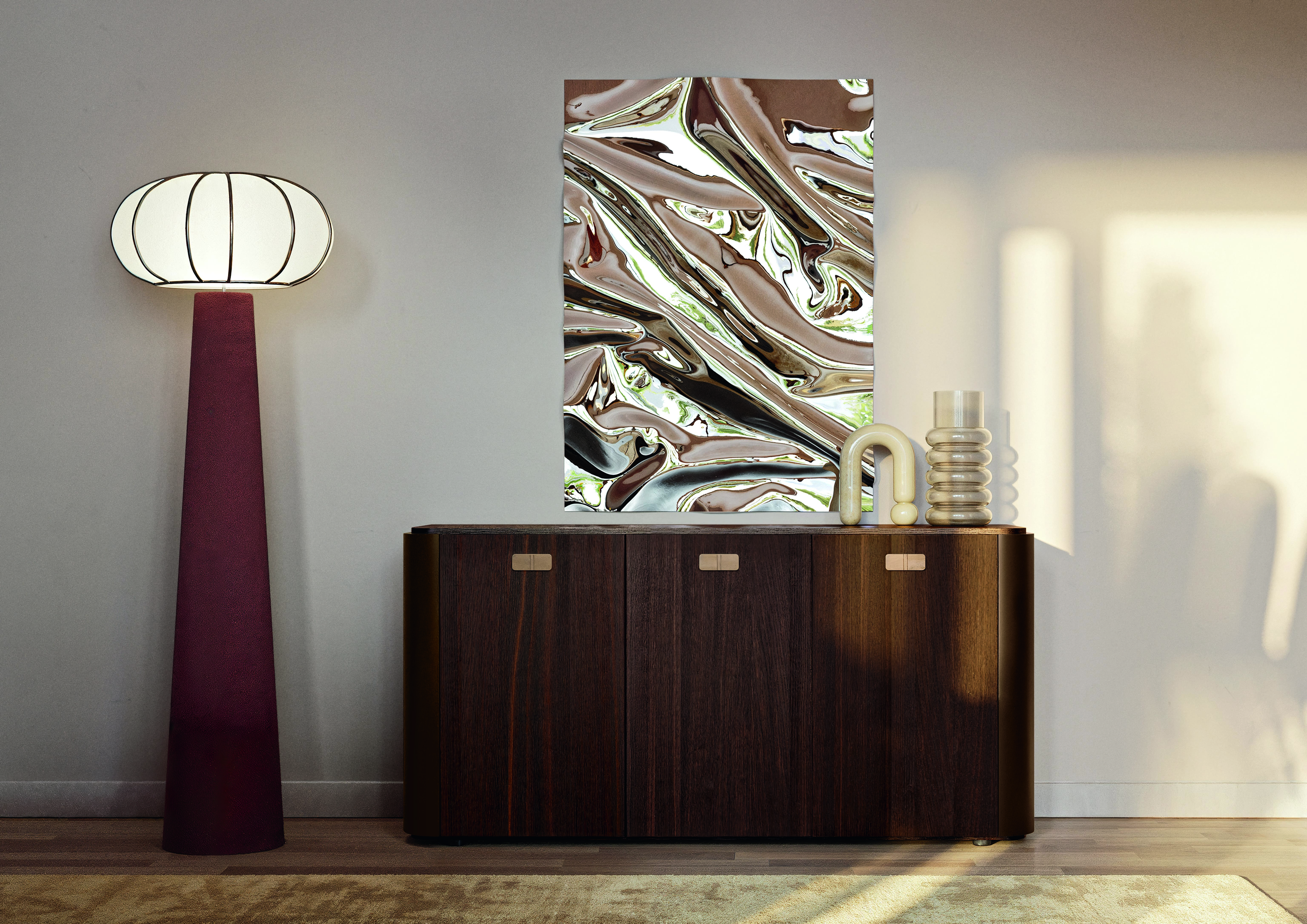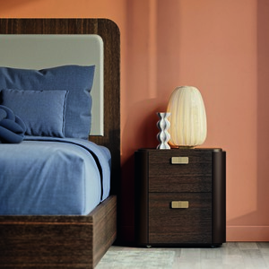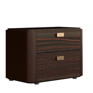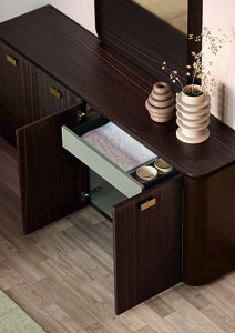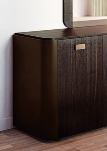 Materials & Finishes: Common finishes include Matte Espresso combined with Termocotto Oak wood veneer, enriched by refined bronze-tone hardware and softly rounded edges.