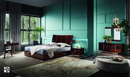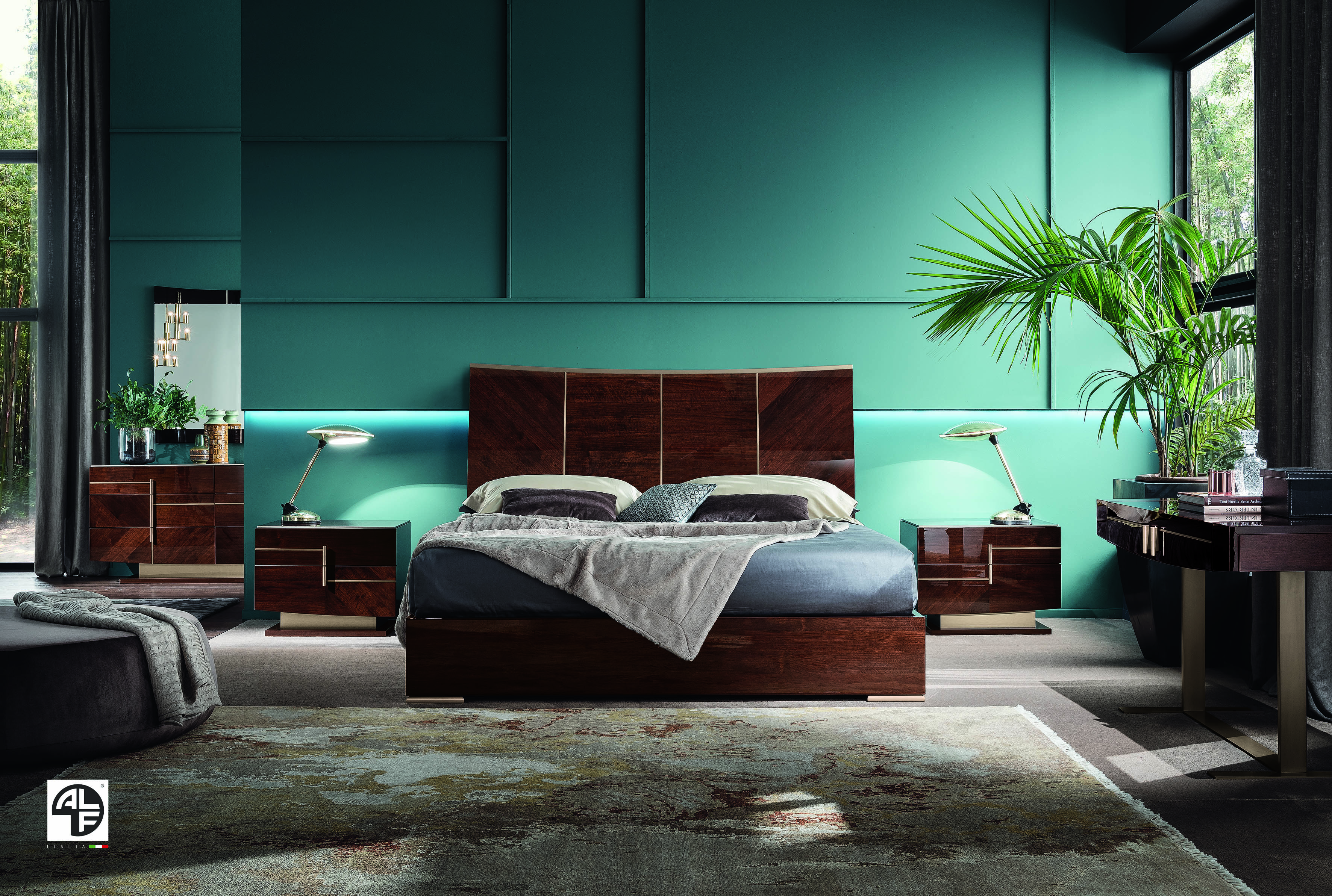 The Bellagio Bed Ensemble by ALF Italia is a graceful and striking design. The collection is crafted from beautiful Italian walnut, which has been finished in a deep warm coffee tone. The way the wood grain shows in this collection is truly remarkable and beautiful. Each piece is adorned with accents in satin rose gold.