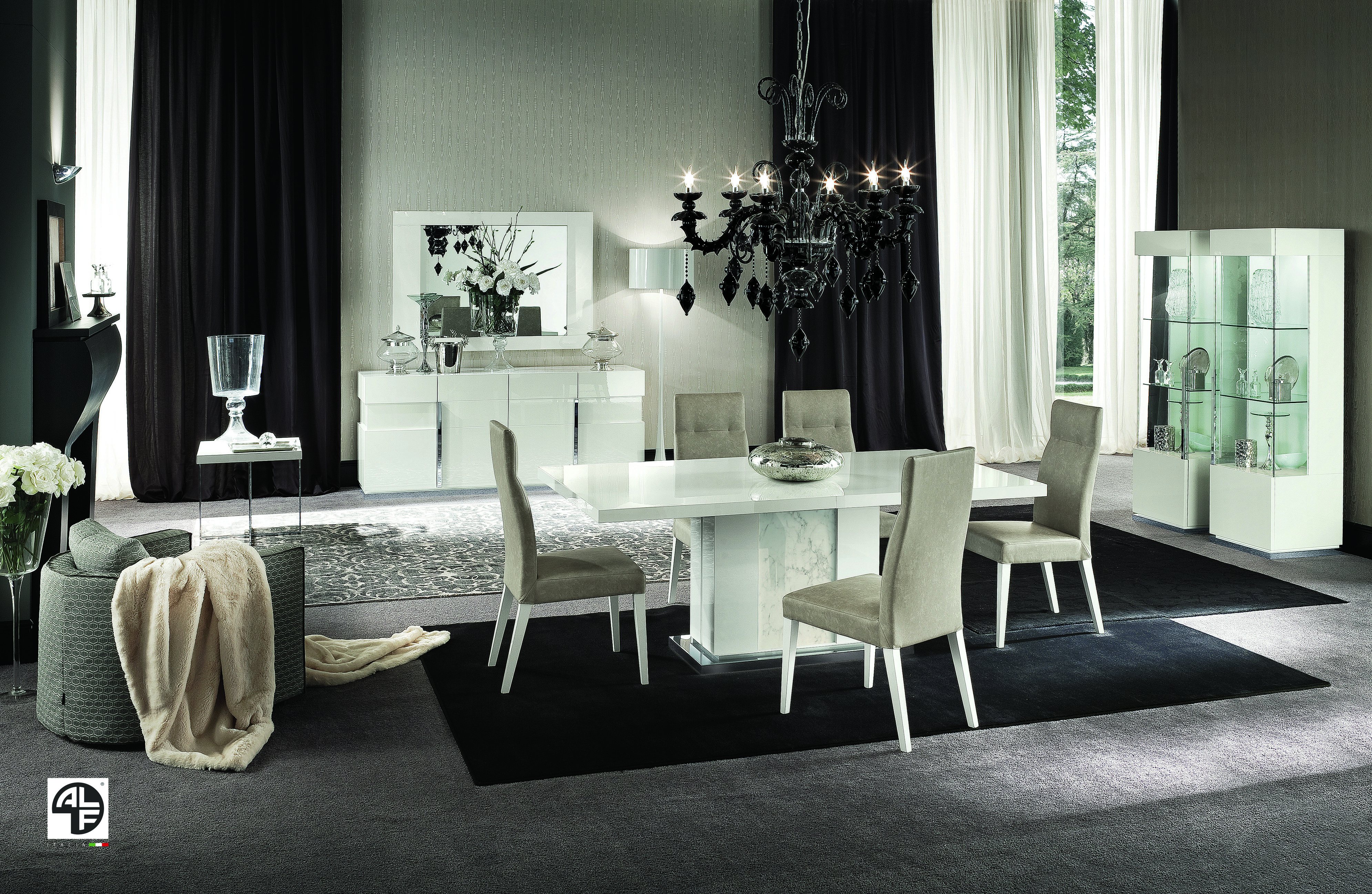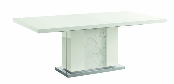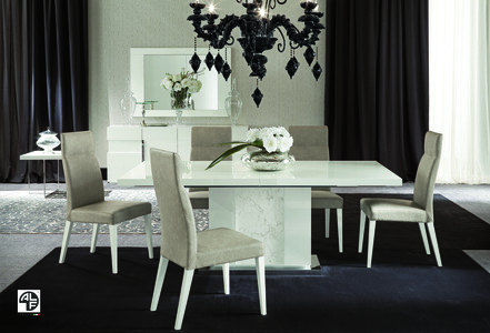 This stunning dining table makes the perfect addition to any modern dining space. The ALF Canova Dining Table is finished in a striking high-gloss lacquer, while Carrara marble runs down its base, finishing with a mirrored trim. Inviting guests? This table is extendable, making it the perfect solution for practicality and modern style. Made in Italy.