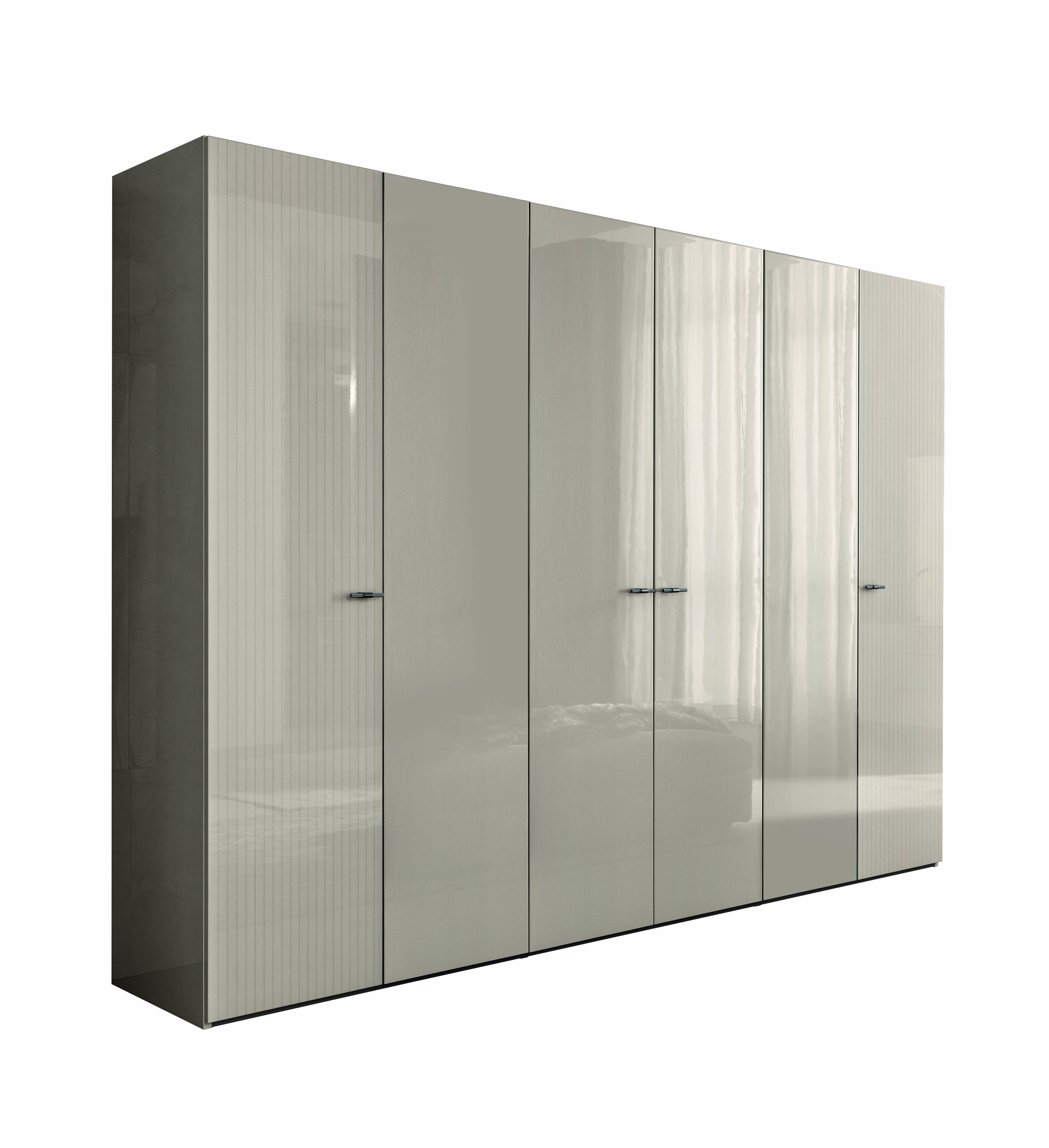 6 DOOR SOLID DOOR WARDROBE For the sophisticated modern bedroom, the Alf Italia Claire 6 Door Mirrored Wardrobe is functional and incredibly stylish. A classy take on neutrals, the light color of this designer Italian wardrobe balances a dark toned room, especially when styled alongside other pieces in the Claire range, creating a sleek Italian bedroom set. PEARL HIGH GLOSS FINISH Like other ranges by Alf furniture, this mirrored wardrobe is made from veneer. This is then applied with layer upon layer of lacquer to give an ultra-high gloss finish that oozes luxury. The Claire Collection is characterized by its light, pearl toned color, horizontal handles and vertically lined cabinet fronts, adding a touch of detail that creates a smart modern look. High Gloss Pearl Finish 6 Lacquered Doors, Made in Italy.