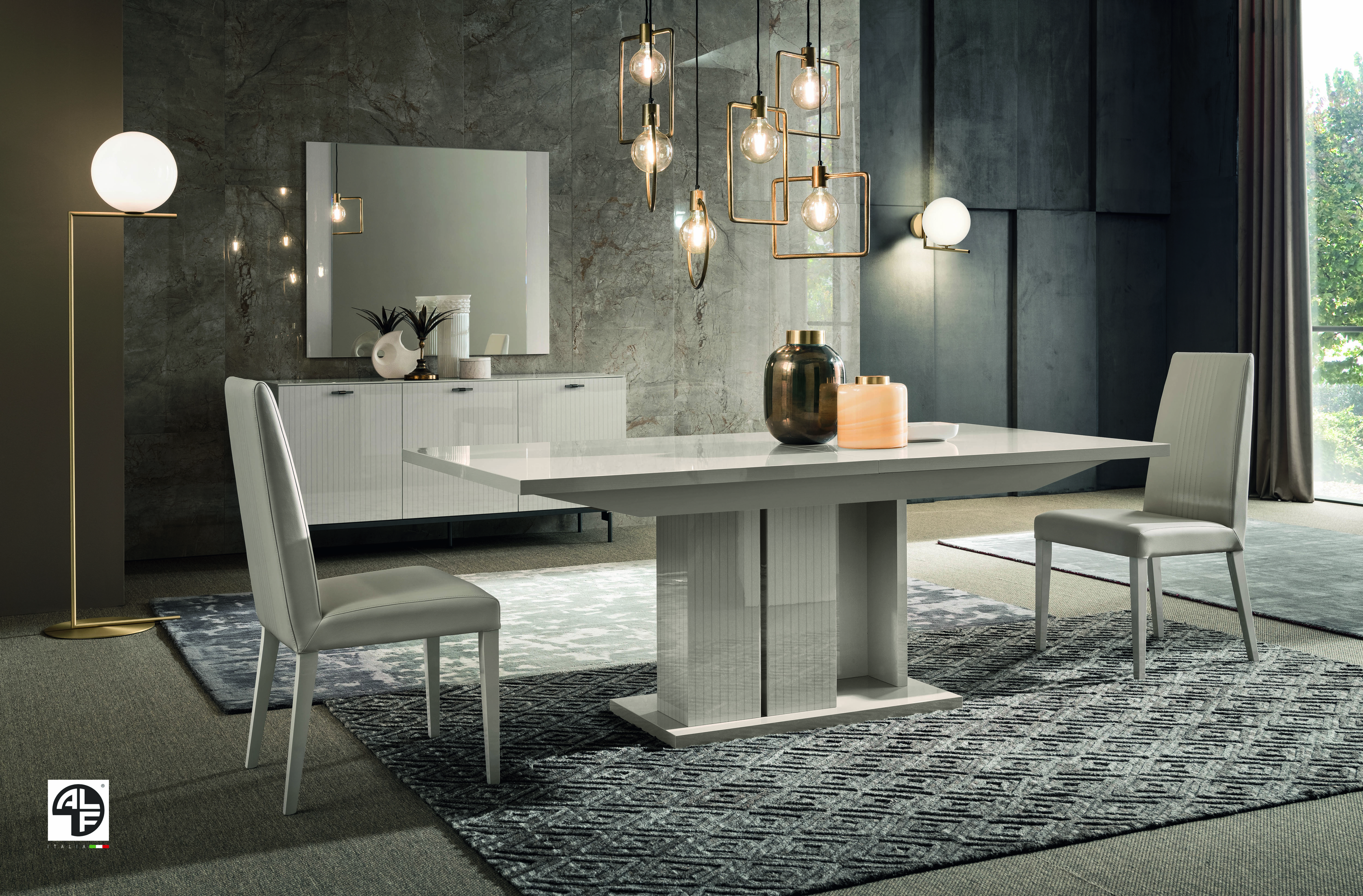 The Claire Dining Room Set is an elegant collection that emphasizes bold design with modern aspects. This set features bold Pearl Eco Veneer High Gloss and Chrome accents. Its style entails a pleasant contrast between light wood veneer and metal elements painted in metallic gray. Claire Dining Table is available in two extendable sizes to fit your space.