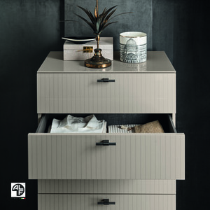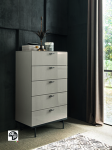 HIGH GLOSS 5 DRAWER CHEST For the sophisticated modern bedroom, the Alf Italia Claire High Gloss 5 Drawer Chest is functional and incredibly stylish. This Italian design features smart proportions to suit a modern bedroom scheme. A classy take on neutrals, this 140cm tall chest balances a dark toned room, especially when styled alongside other pieces in the Claire range, creating a sleek Italian bedroom set. PEARL HIGH GLOSS FINISH Like other ranges by Alf furniture, this chest of drawers is made from a veneer base. This is then applied with layer upon layer of lacquer to give an ultra-high gloss finish that oozes luxury. The Claire Collection is characterized by its light, pearl toned color, horizontal handles and vertically lined drawer fronts, adding a touch of detail that creates a smart modern look. High Gloss Pearl Finish 5 Spacious Drawers Made in Italy.