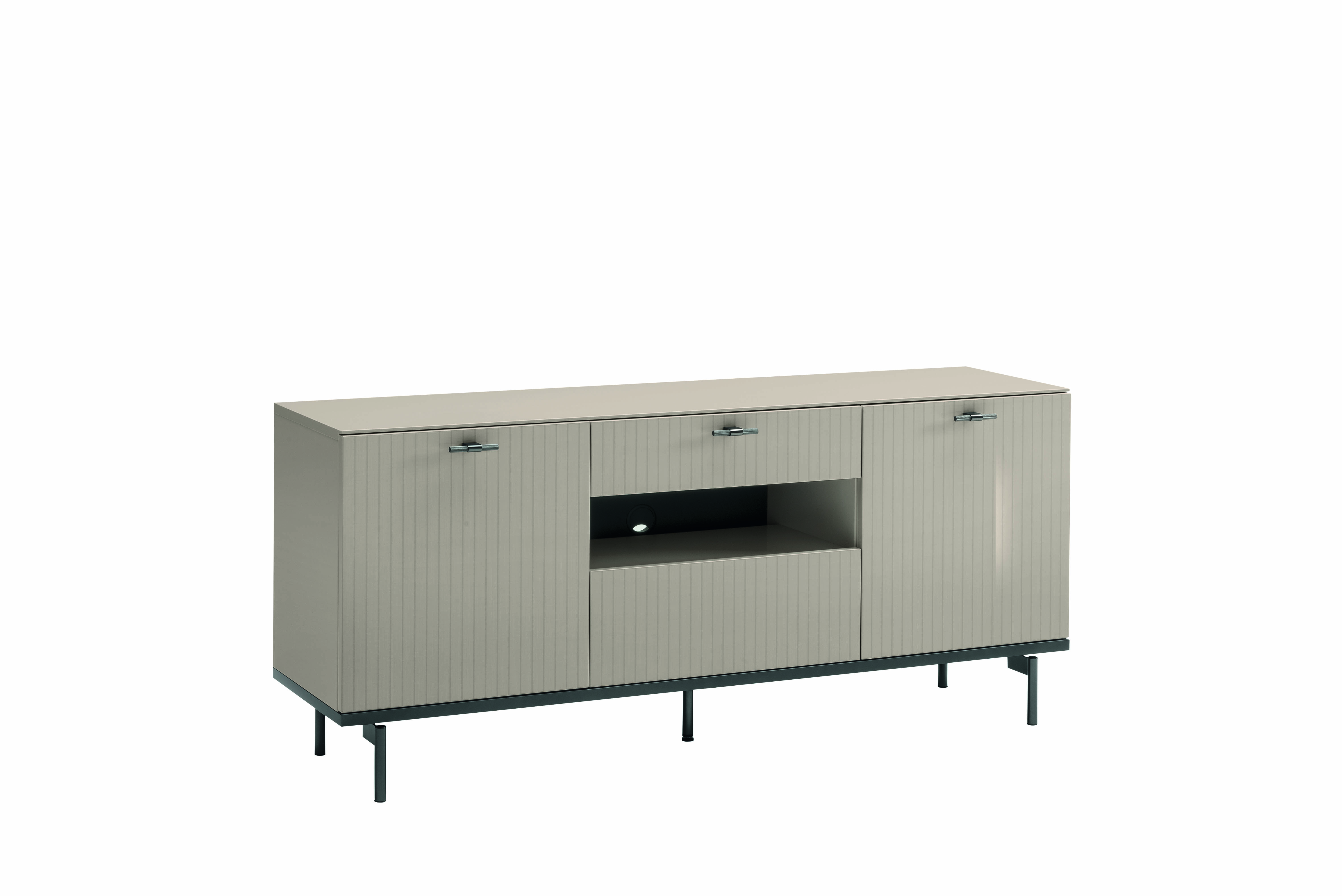 The metal legs not only provide stable support for the TV stand but also create an illusion of a floating unit, adding a modern and stylish element to your living room. The spacious door compartments on the sides, along with the open space, door compartment, and drawer unit in the middle, offer a versatile combination of storage and display space for your everyday items and electronic equipment.
