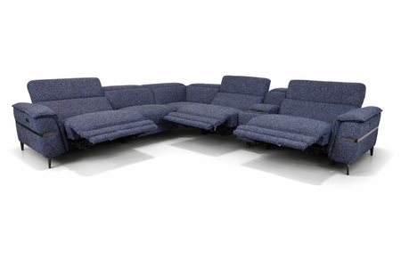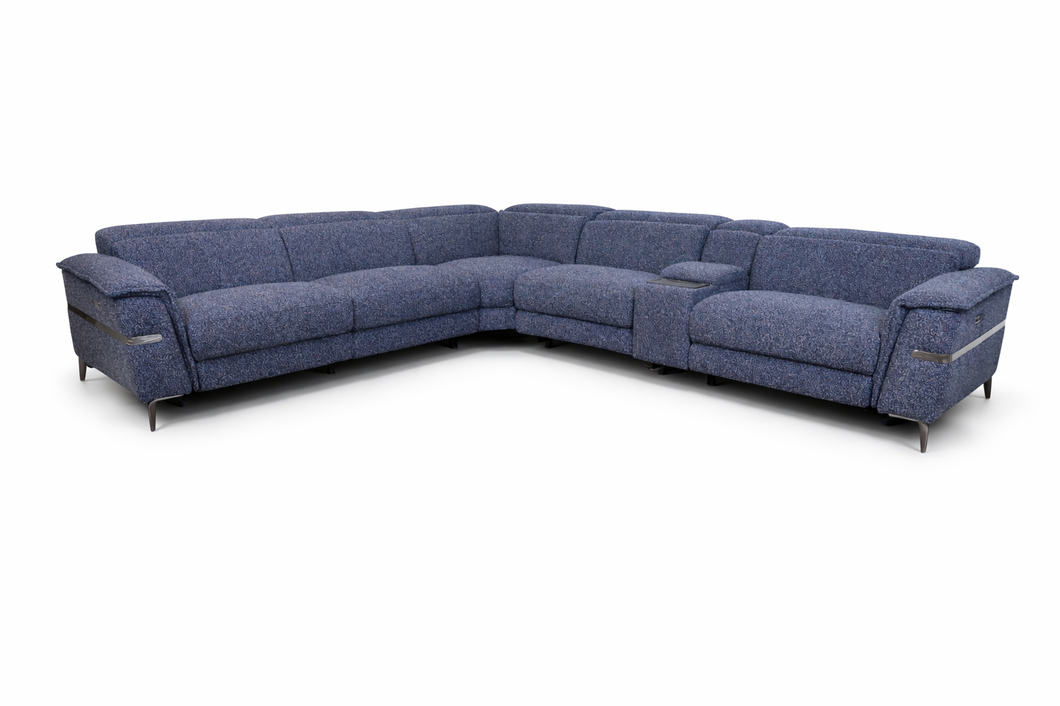 The Costa sectional in indigo seamlessly blends rich color with modern comfort. Its deep, plush seating, clean lines, and sleek metal legs create a spacious L-shaped design that exudes style and invites relaxation. This sectional is perfect for everyday living and entertaining. 6 Seat 3 Power
