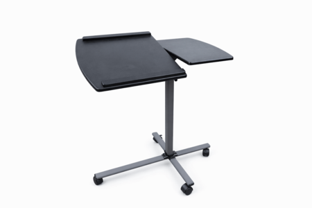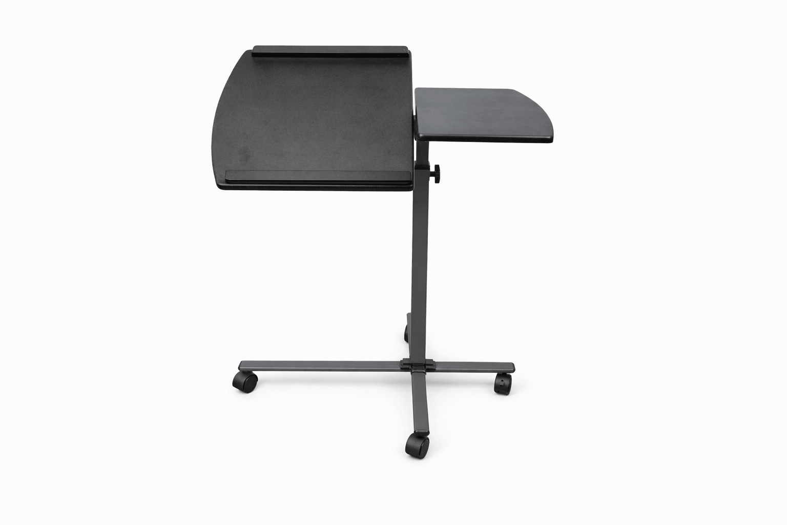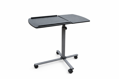This adjustable overbed table is designed for convenience, functionality, and everyday versatility. Featuring a split tabletop design, it offers both a tilting surface with a raised edge—ideal for laptops, books, or tablets—and a fixed side surface for additional items.