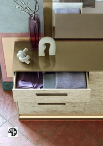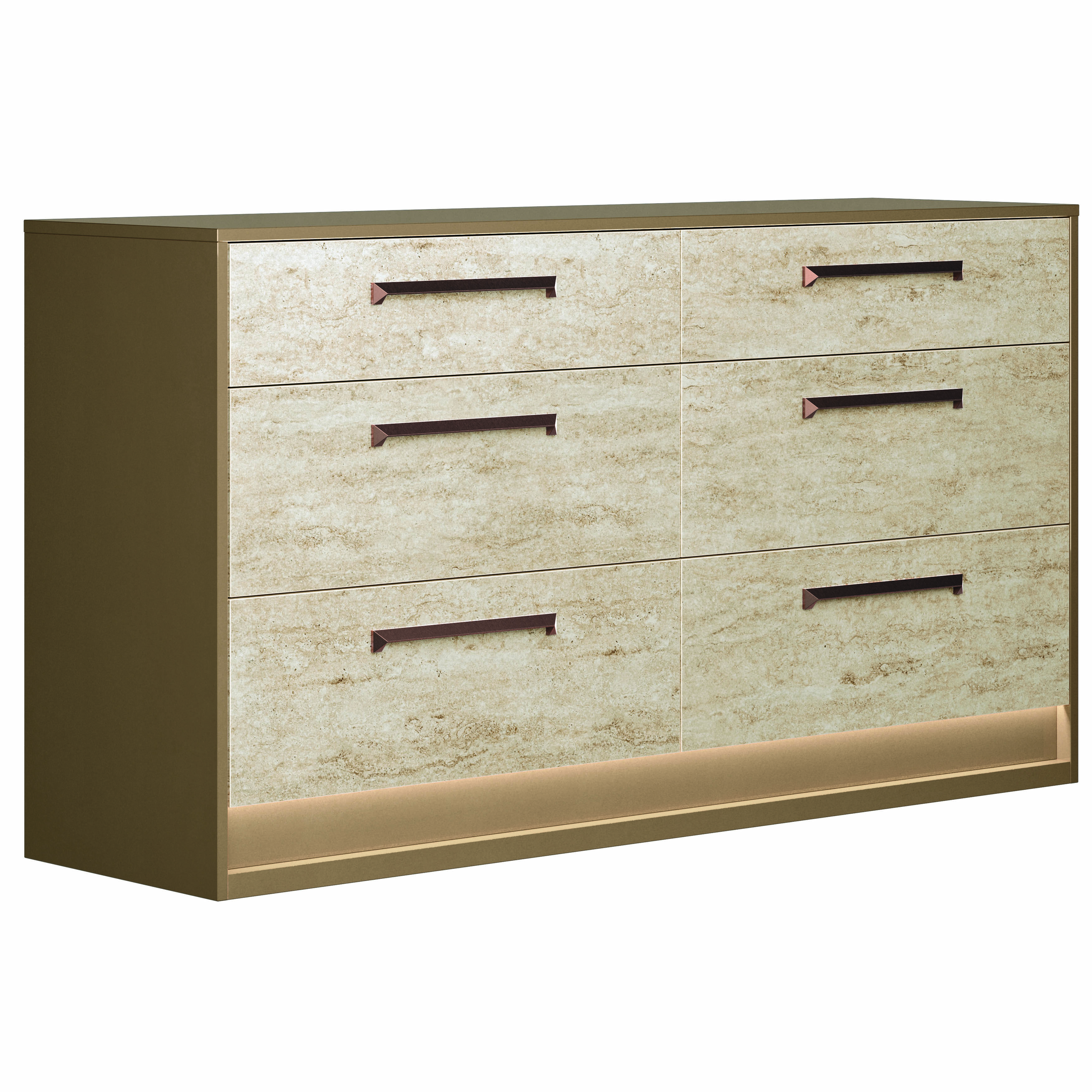 Finish / Materials: Gold High Gloss & Travertino Eco Stone, using MDF/Wood Veneer construction.
