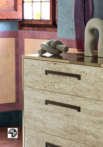 It emphasizes a blend of lush textures and elegant finishes — notably uses Travertino eco stone (a kind of faux/eco-friendly travertine stone finish) with gold accents/high gloss detailing.