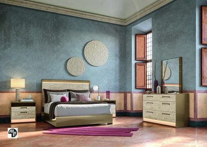 | Finish / materials | “Travertino eco stone”, gold high gloss, smooth flat surfaces, lit niches. |