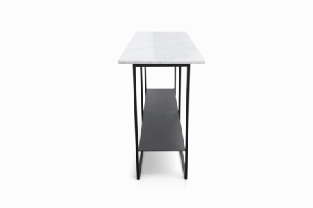 Sleek and minimalist, this console table features a clean-lined metal frame in a black finish paired with a light-toned top for a contemporary contrast. The open base design includes a lower shelf, offering additional space for storage or display.