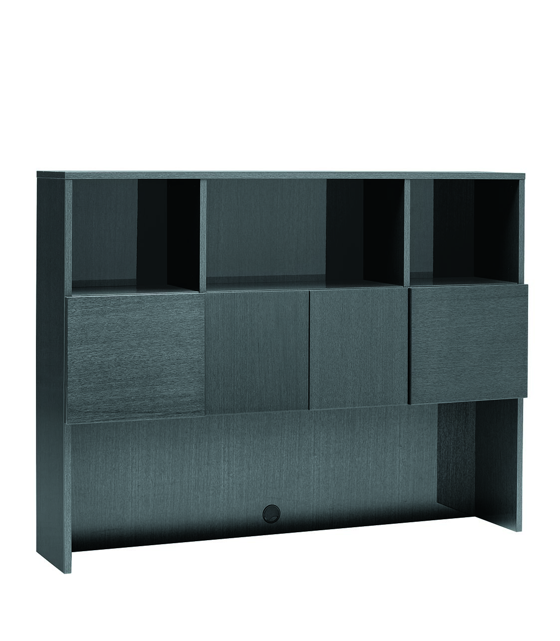 Features described: the credenza includes a file drawer, a key-locked smaller drawer, door compartments; the hutch adds shelving/storage above.