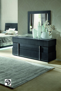 The mirror is part of the Montecarlo bedroom suite which uses high-gloss Kotò veneer paired with chrome metal profiles.