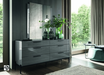 The Novecento collection by Alf Italia is characterized by its sophisticated contemporary Italian design, meticulous attention to detail, and Silverwood high-gloss finish that creates luminous, silvery reflections across the furniture surfaces. It blends wood, metal accents, and padded eco-leather elements for a distinctive upscale aesthetic.