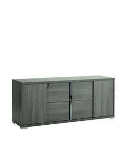 Finish: Matte Grey Oak eco veneer with minimalist chrome handles — warm wood tones with a contemporary linear aesthetic.