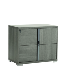 Finish: Matte Grey Oak eco veneer with minimalist chrome handles — warm wood tones with a contemporary linear aesthetic.
