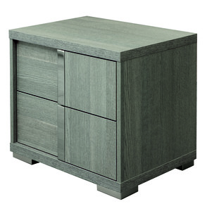 Finish: Matte Grey Oak eco veneer with minimalist chrome handles — warm wood tones with a contemporary linear aesthetic.